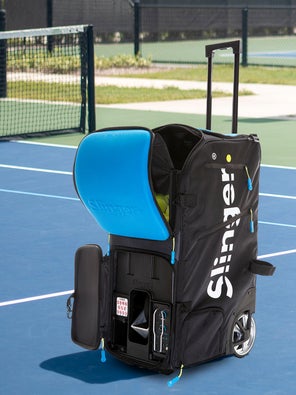 The Slinger Bag is the most portable affordable and easy-to-use ball launcher in tennis. A ball launcher constructed for maximum portability it has a straightforward user-friendly design. The Slinger Bag is a portable ball machine that looks like a large sports bag with big wheels and a shoulder strap.